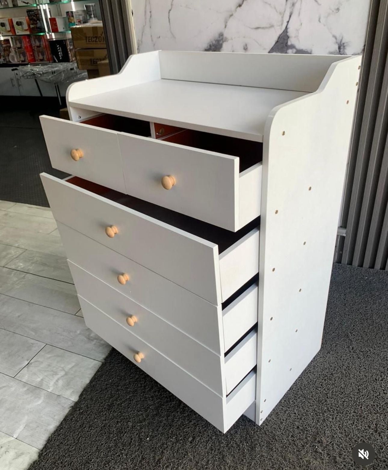 Dale un toque de estilo y organización a tu habitación con este hermoso gavetero de diseño moderno. Su acabado blanco, líneas suaves y perillas en tono madera crean un look limpio y elegante que combina con cualquier espacio.