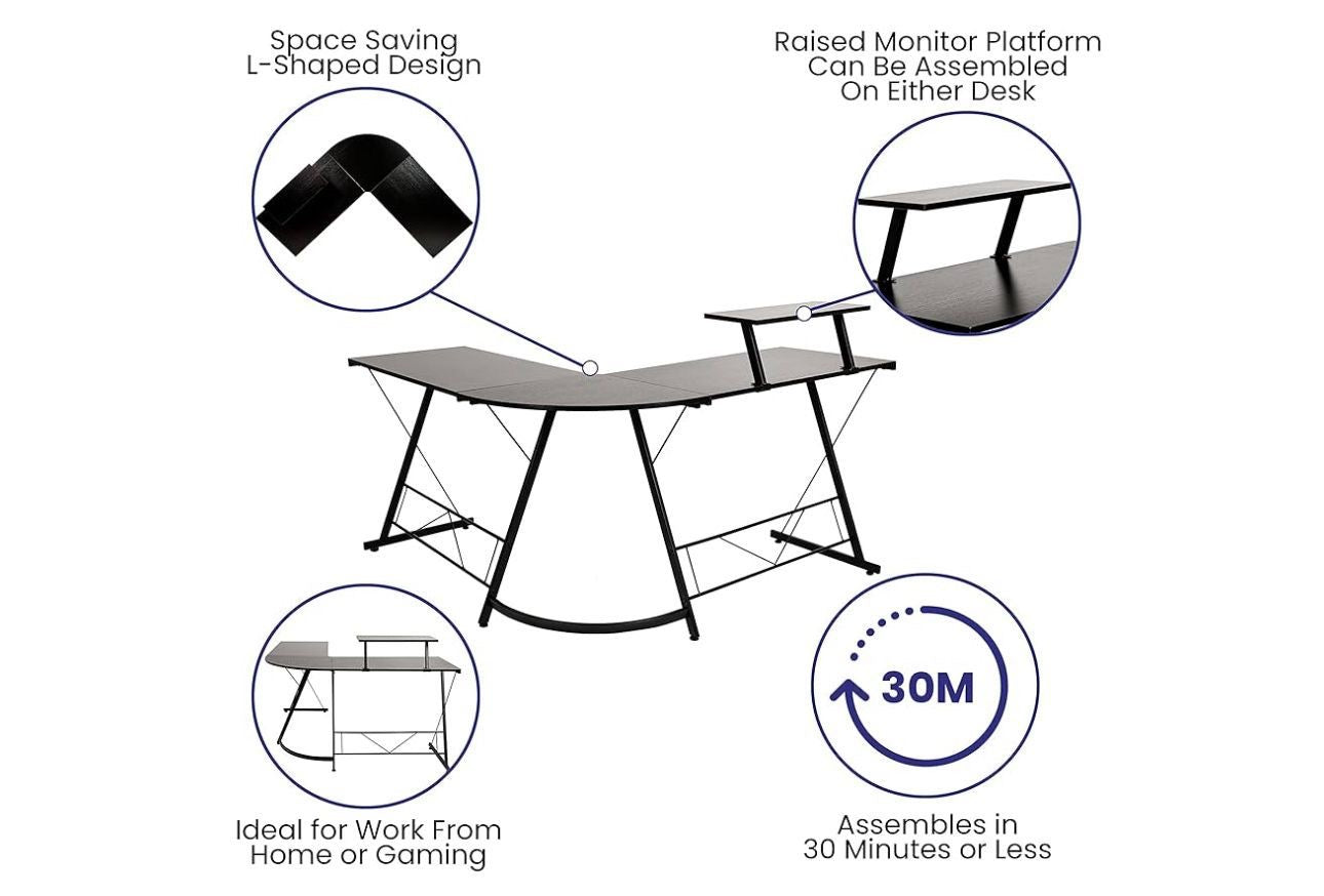 ✔️ Funcionalidad extra: incluye soporte elevado para monitores, gaveta deslizable para teclado o papelería, ganchos laterales para audífonos y colgador de mochila.