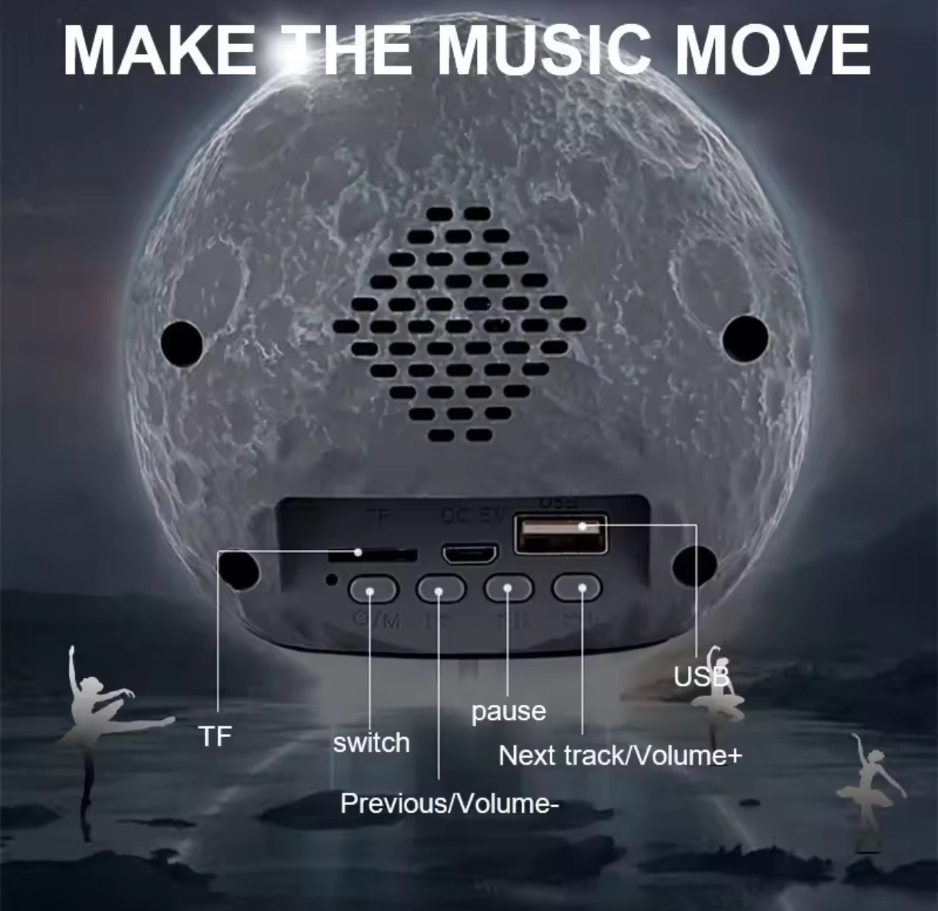 • Diseño decorativo único: astronauta flotando sobre la luna con luces LED RGB que cambian de color.