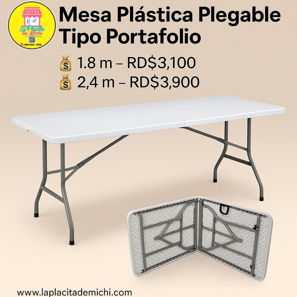 🪑 Mesa Plástica Plegable Tipo Portafolio 💰 1.8 m – RD$3,100 💰 2.4 m – RD$3,900